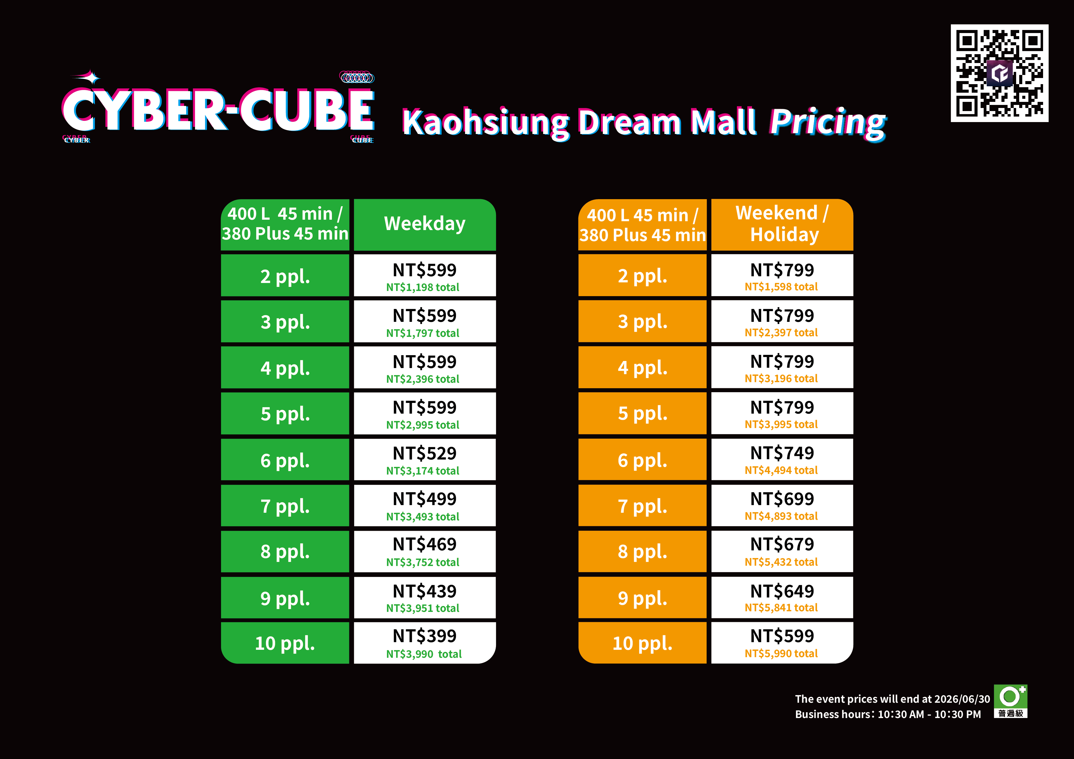 The reservation platform offers different discounted, regular, and busy hour prices. Please refer to the reservation website for the exact pricing. For more details, check the official website or promotional materials. CyberCube reserves the right to final pricing and interpretation.
