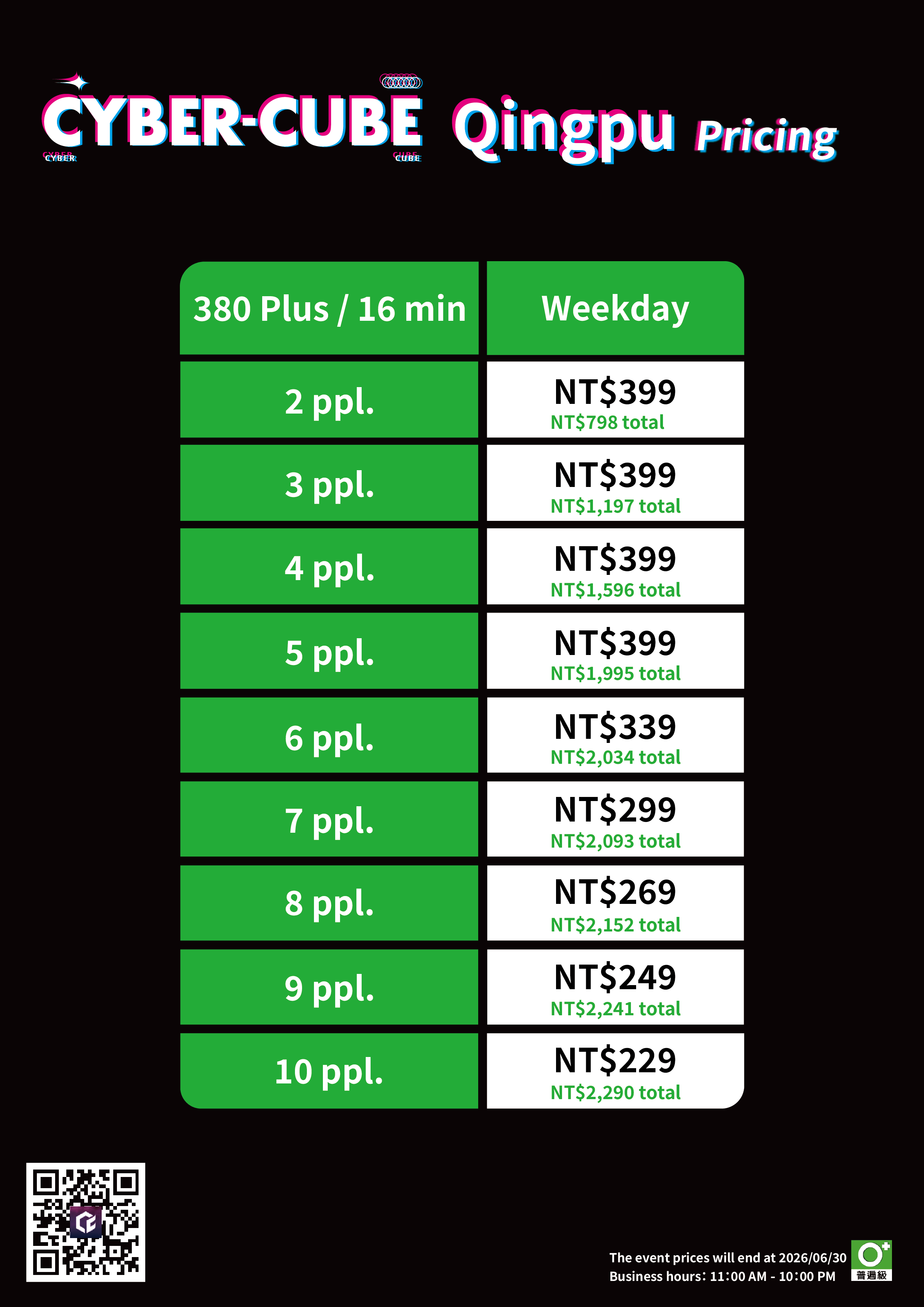The reservation platform offers different discounted, regular, and busy hour prices. Please refer to the reservation website for the exact pricing. For more details, check the official website or promotional materials. CyberCube reserves the right to final pricing and interpretation.