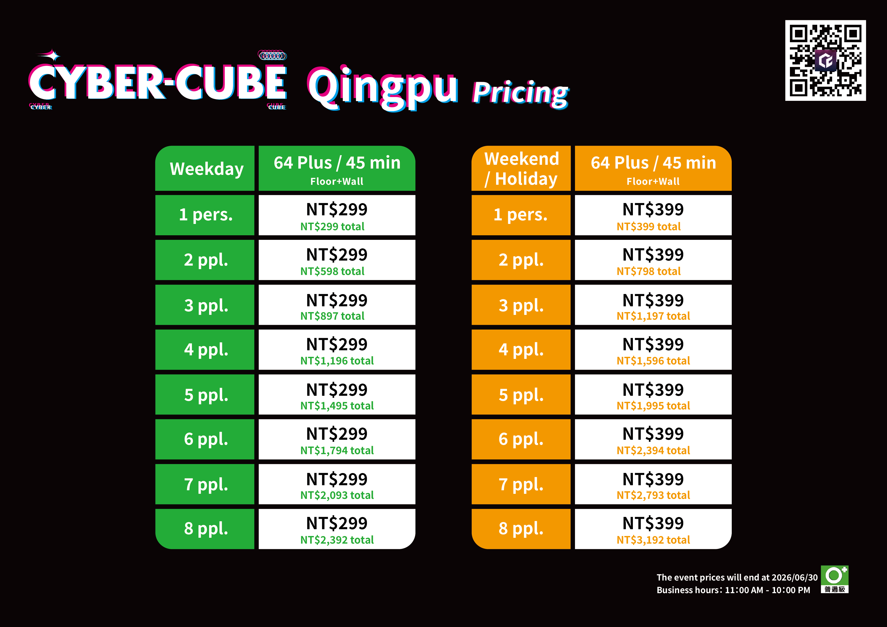 The reservation platform offers different discounted, regular, and busy hour prices. Please refer to the reservation website for the exact pricing. For more details, check the official website or promotional materials. CyberCube reserves the right to final pricing and interpretation.