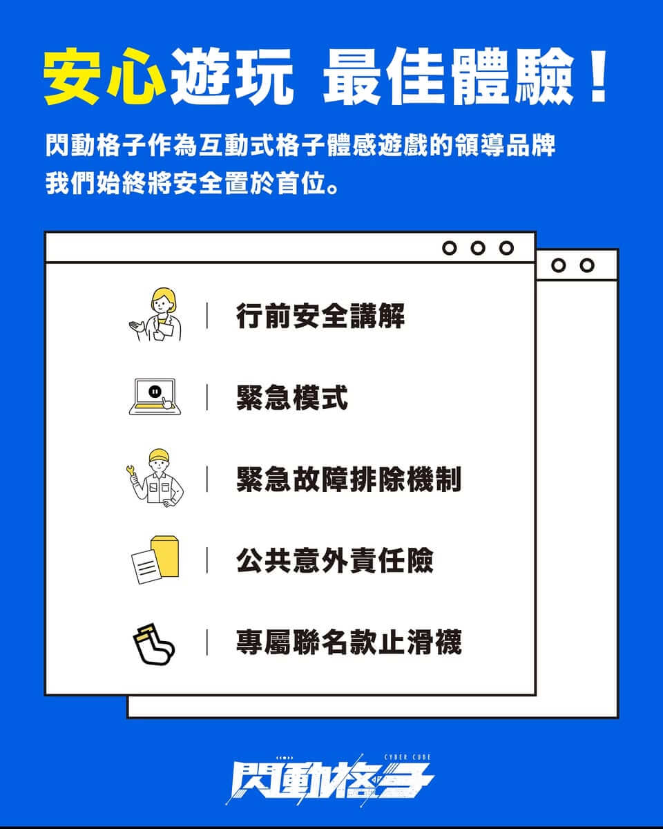 《閃動格子》是台灣首創且唯一原創的沈浸式互動體感遊戲品牌,我們致力於為玩家提供最優質的遊戲體驗。 《閃動格子》的名稱以及我們提供的遊戲方式皆受商標及智慧財產權法保障。近期,我們注意到市場上出現了一些與我們相似的名稱和設備,為避免玩家們的混淆誤認,我們在此鄭重聲明:目前我們的營業據點僅限於台北旗艦店、台中旗艦店、高雄旗艦店、公館體驗店、新店威秀店、青埔環球店、竹北六家店、台南中山店、高雄夢時代店、中壢中原店,其餘據點皆非《閃動格子》所經營。建議玩家在遊玩前務必認明《閃動格子》之名稱及圖案,以確保您享受我們精心設計的原創體驗!
