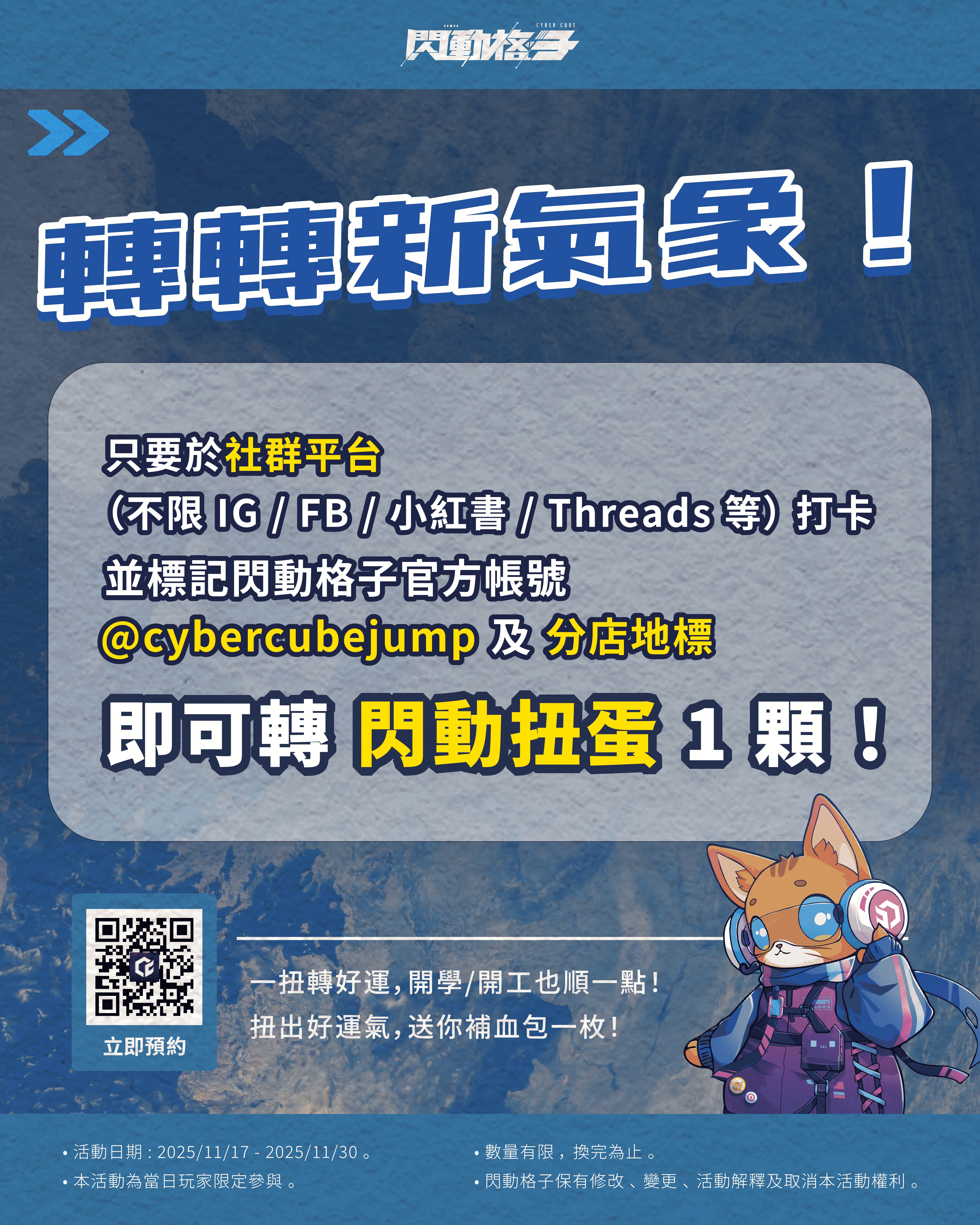 一扭轉好運,開學/開工也順一點! 扭出好運氣,送你補血包一枚! 只要於社群平台(不限 IG / FB / 小紅書 / Threads 等)打卡, 並標記【@cybercubejump】及分店地標,即可轉 閃動扭蛋 1 顆!🎁✨ 數量有限,換完為止 !