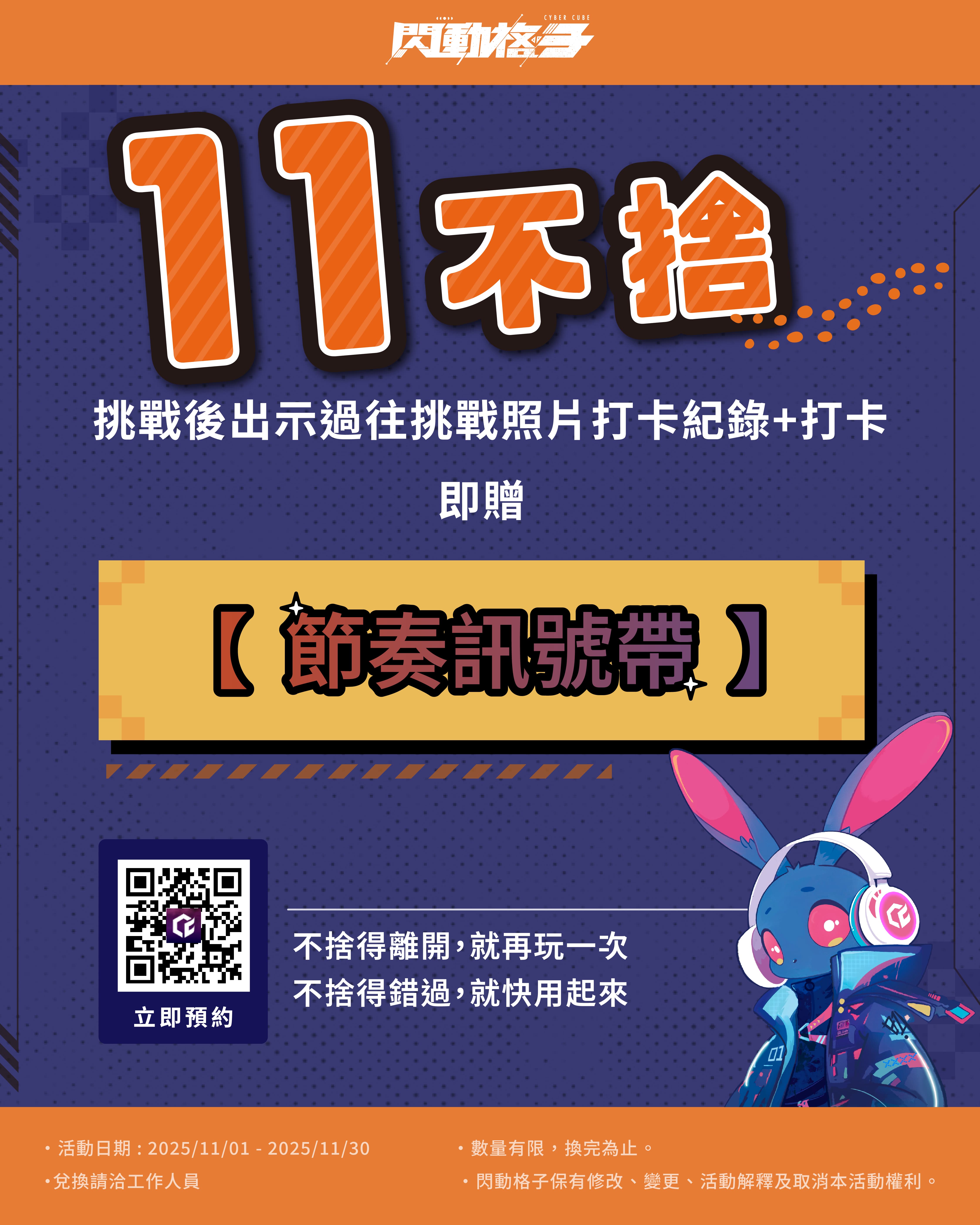 閃動要來送好禮啦🤩 挑戰完後,現場出示過往挑戰的照片/打卡紀錄,並再次打卡,即可免費兌換【節奏訊號帶 】, 戴著閃動格子專屬運動頭巾再次挑戰吧 !🎉 數量有限,換完為止 ! #閃動格子 #體感遊戲 #11月活動 #CyberCube #送好禮