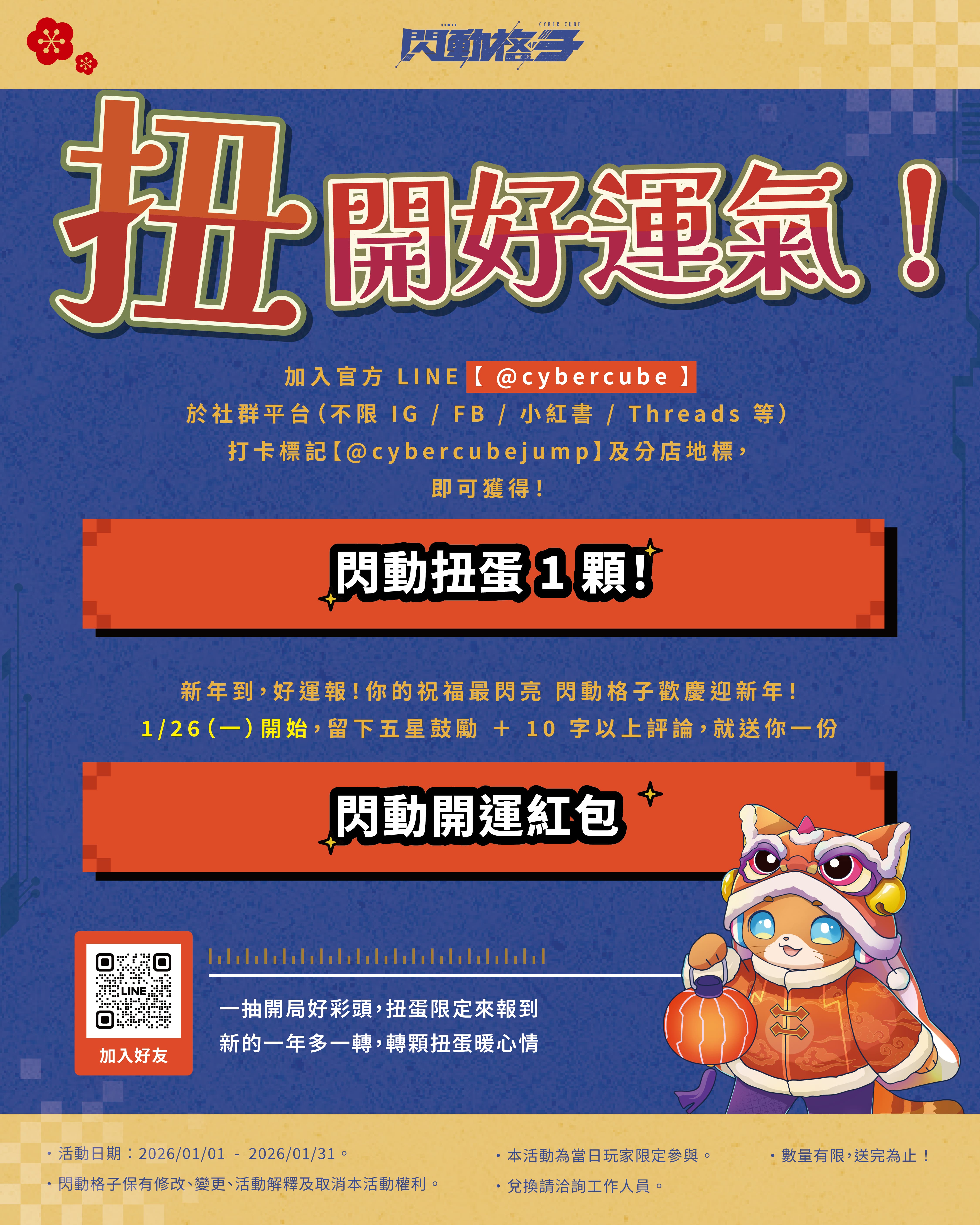 加入官方 LINE【@cybercube】或 於社群平台(不限 IG / FB / 小紅書 / Threads 等)打卡標記【@cybercubejump】及分店地標, 即可轉 閃動扭蛋 1 顆!🎁✨ 數量有限,換完為止 ! 一抽開局好彩頭,扭蛋限定來報到 新的一年多一轉,轉顆扭蛋暖心情 新年到,好運報!你的祝福最閃亮✨閃動格子歡慶迎新年! 1/26(一)開始,留下五星鼓勵+ 10 字以上評論,就送你一份「閃動開運紅包」🧧 📌本活動為當日玩家限定參與