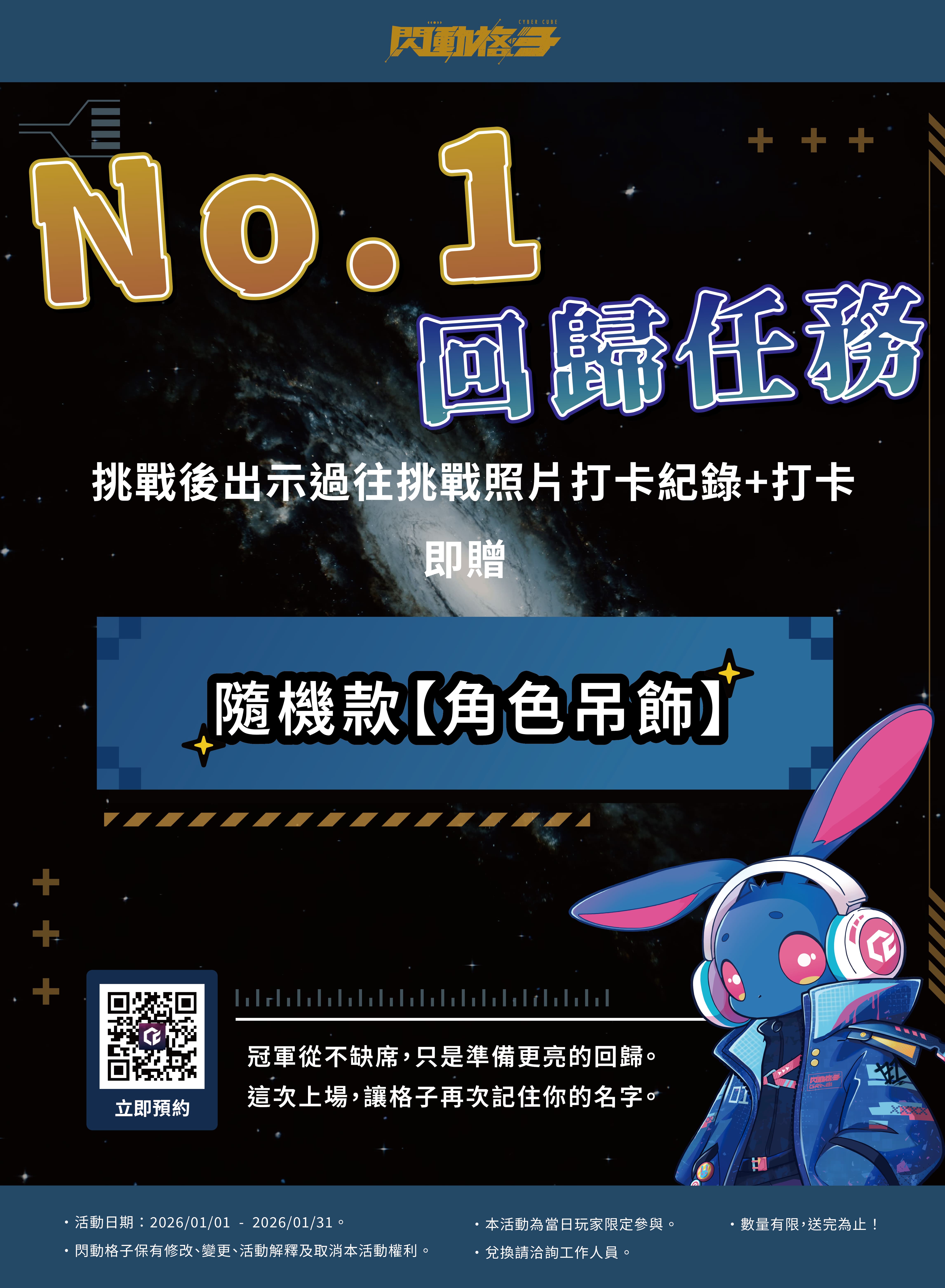 冠軍從不缺席,只是準備更亮的回歸。 這次上場,讓格子再次記住你的名字。 挑戰完後,現場出示過往挑戰的照片/打卡紀錄,並再次打卡,即可兌換乙份隨機款【角色吊飾】🎉 數量有限,換完為止 ! #閃動格子#體感遊戲#送好禮#1月活動#cybercube