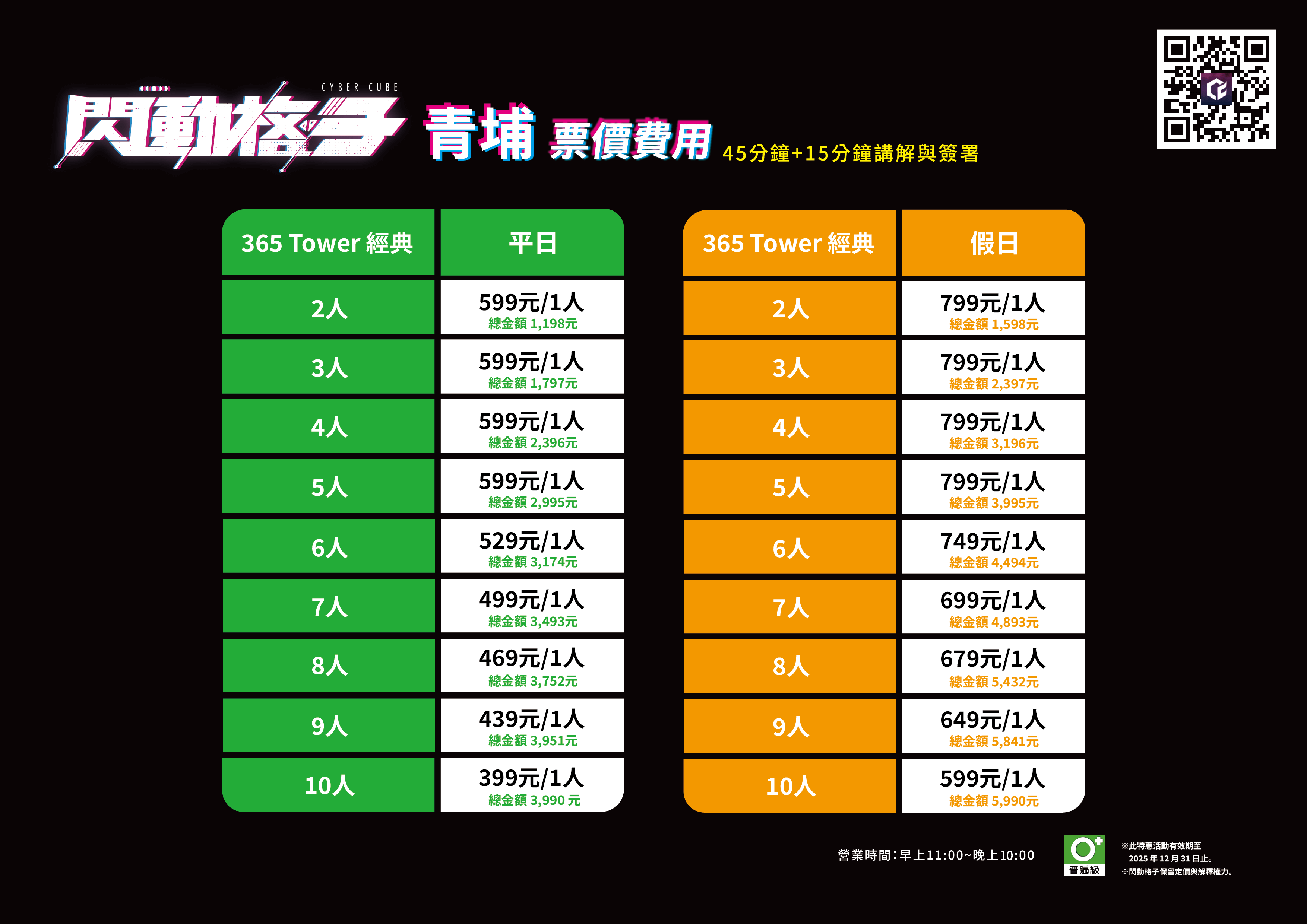 基於遊戲系統限制,365 Tower 挑戰區適用遊玩人數為 2 - 10 人。若超出適用人數,需預約連續時段並分組進行遊玩。