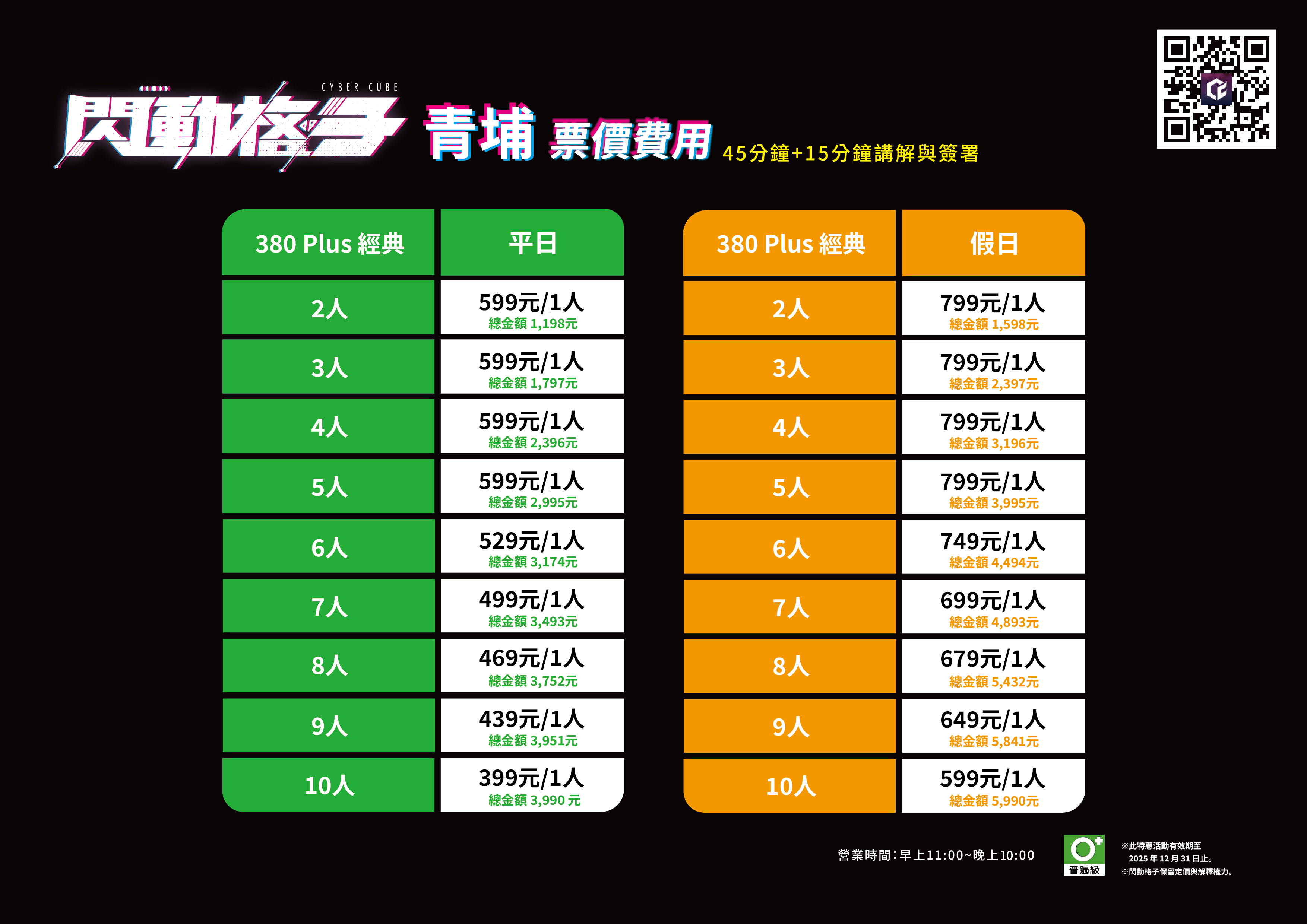 基於遊戲系統限制,380 Plus 挑戰區適用遊玩人數為 2 - 10 人。若超出適用人數,需預約連續時段並分組進行遊玩。