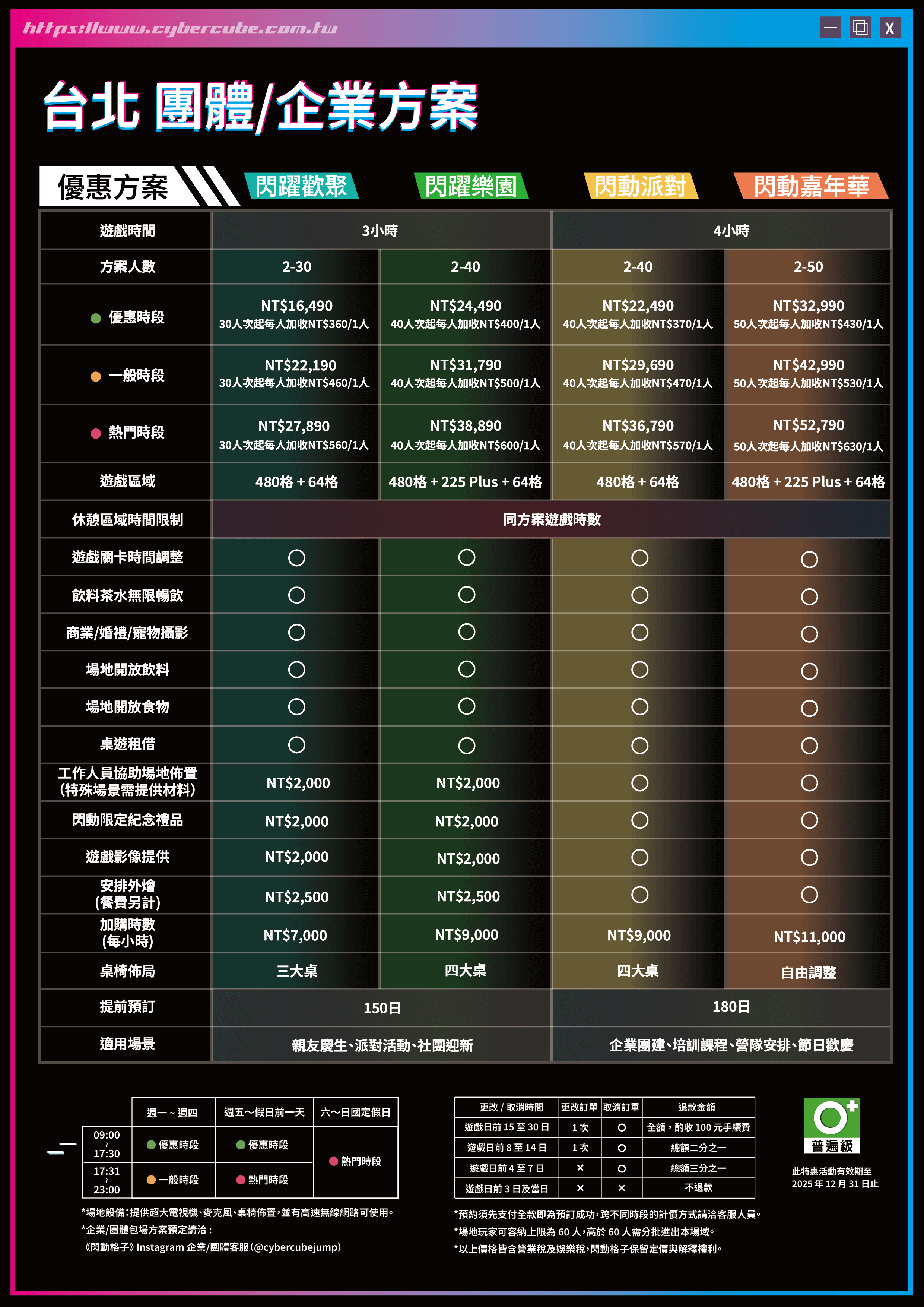 只要入館就會計算人數,且對應不同方案酌收相關費用哦。 若未支付玩家票者須於15分鐘內離場, 且若中途再進入店內,則會直接收取相關費用。