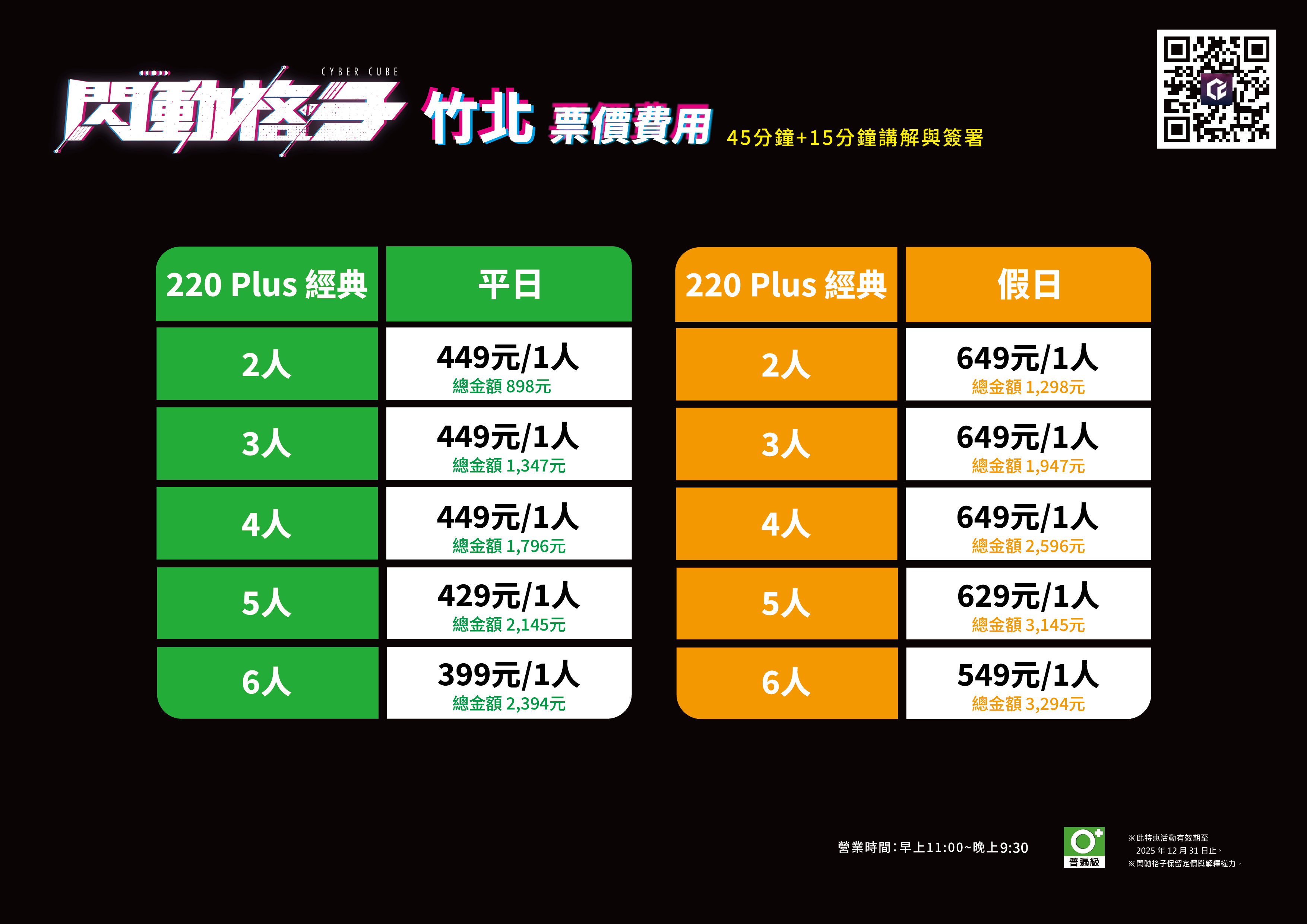 基於遊戲系統限制,220 Plus 挑戰場適用遊玩人數為 2 - 6 人。若超出適用人數,需預約連續時段並分組進行遊玩。