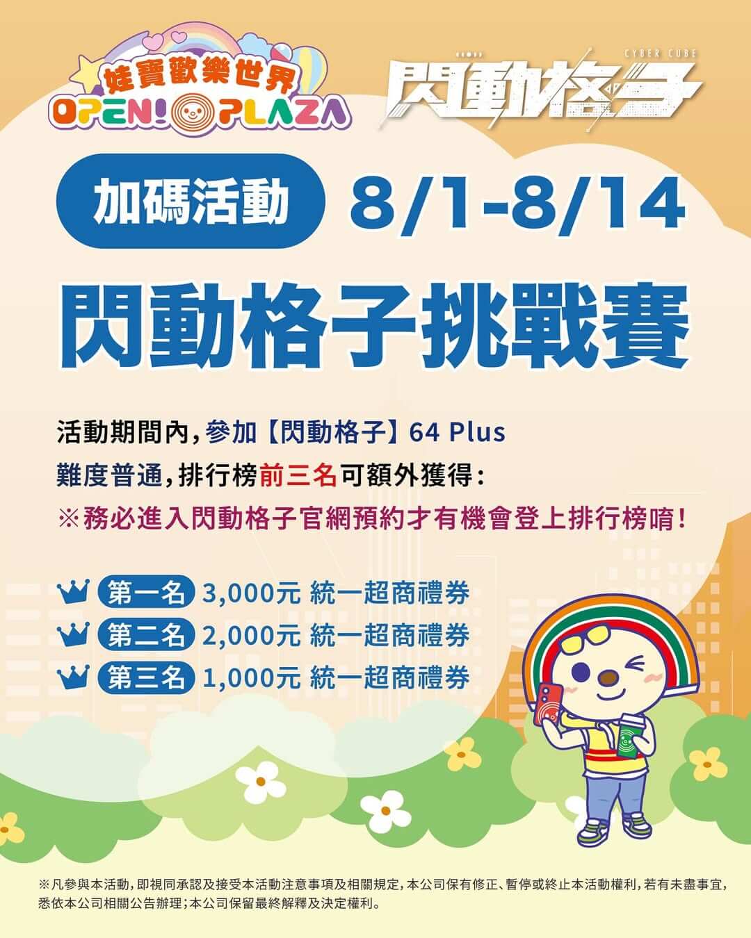 💫娃寶歡樂世界 加碼閃動格子挑戰賽🏆 讓你可以玩遊戲拿好禮🎉 活動期間內,參加【閃動格子】64 PLUS 難度:普通,排行榜前三名將能獲得統一超商禮券!! *務必進入閃動格子官網預約才有機會登上排行榜唷! 📌娃寶歡樂世界:高雄市三民區義華路92號 🕰️營業時間:24小時無休 #閃動格子 #娃寶歡樂世界 #拿好禮