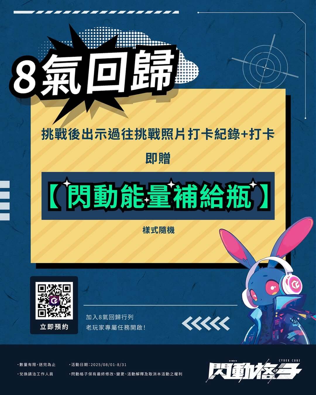 閃動要來送好禮啦🤩 挑戰完畢後,現場出示過往挑戰的照片/打卡紀錄,並再次打卡,即可免費兌換【 閃動能量補給瓶 】!🎉 樣式隨機,數量有限,換完為止 ! 這次不只是回來玩,是帶著8氣回歸🔥 踩過的格子在等你,回來再戰一次吧! 限定挑戰/限定禮物/限定你才有! 加入8氣回歸行列|老玩家專屬任務開啟! #閃動格子 #體感遊戲 #8月活動 #CyberCube #送好禮