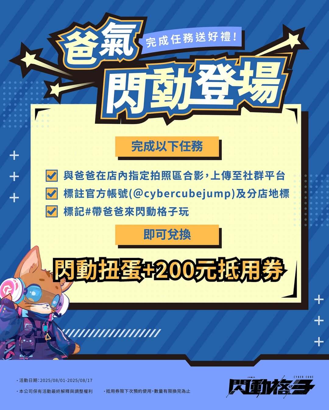 與「爸爸」於店內指定拍照區拍照合影,並上傳至任一社群平台(IG/FB/Threads/小紅書等)完成以下任務: - 標註官方帳號:@cybercubejump - 加上分店地標 - 使用指定 Hashtag:#帶爸爸來閃動格子玩 完成後,出示貼文或限動畫面給現場工作人員,即可兌換: 🎁 閃動扭蛋 1 顆 + 200 元抵用券 1 張(抵用券限下次預約使用,數量有限換完為止) #閃動格子 #體感遊戲 #8月活動 #CyberCube