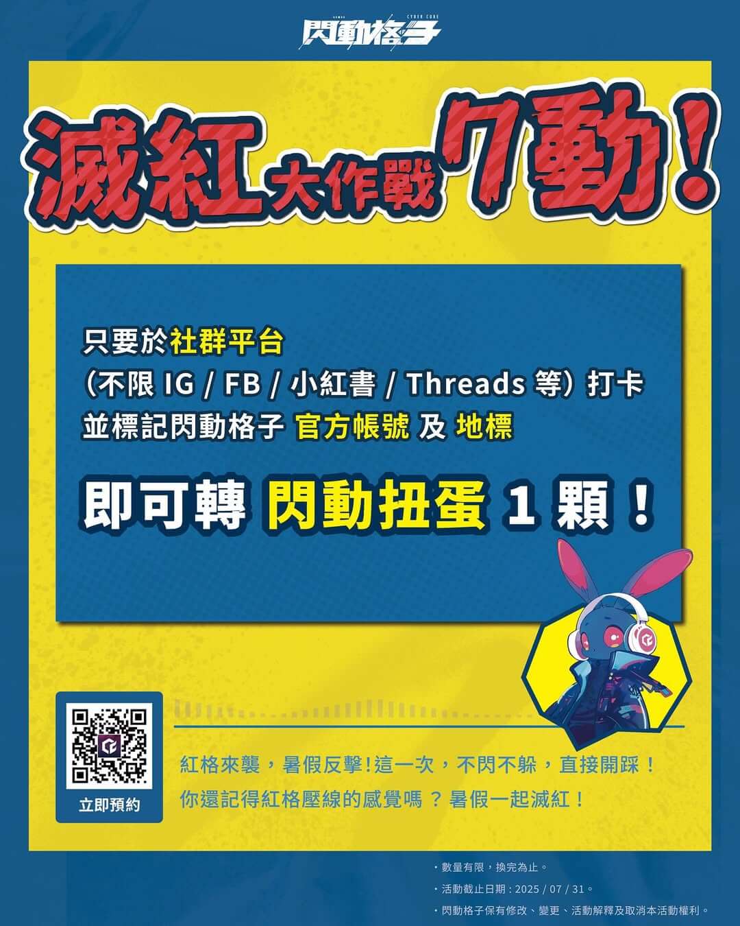 紅格來襲,暑假反擊!這一次,不閃不躲,直接開踩! 你還記得紅格壓線的感覺嗎?暑假一起滅紅⚡ 現場流程: 1. 玩家拍攝照片或影片,可在遊戲中、拍照區、門市內等場景。 2. 玩家社群平台公開發布貼文或限時動態,並標記【@CyberCube(閃動格子官方帳號)】及地標。 (分店可選擇標記分店帳號或總部帳號) 3. 向現場工作人員出示貼文或限時動態,即可獲得扭蛋機兌換機會!🎉 4. 工作人員拿扭蛋代幣給玩家,讓玩家自行投入並轉扭蛋,開獎後再拿取相對應的禮物給玩家。 #閃動格子 #體感遊戲 #好禮送 #7月活動 #cybercube