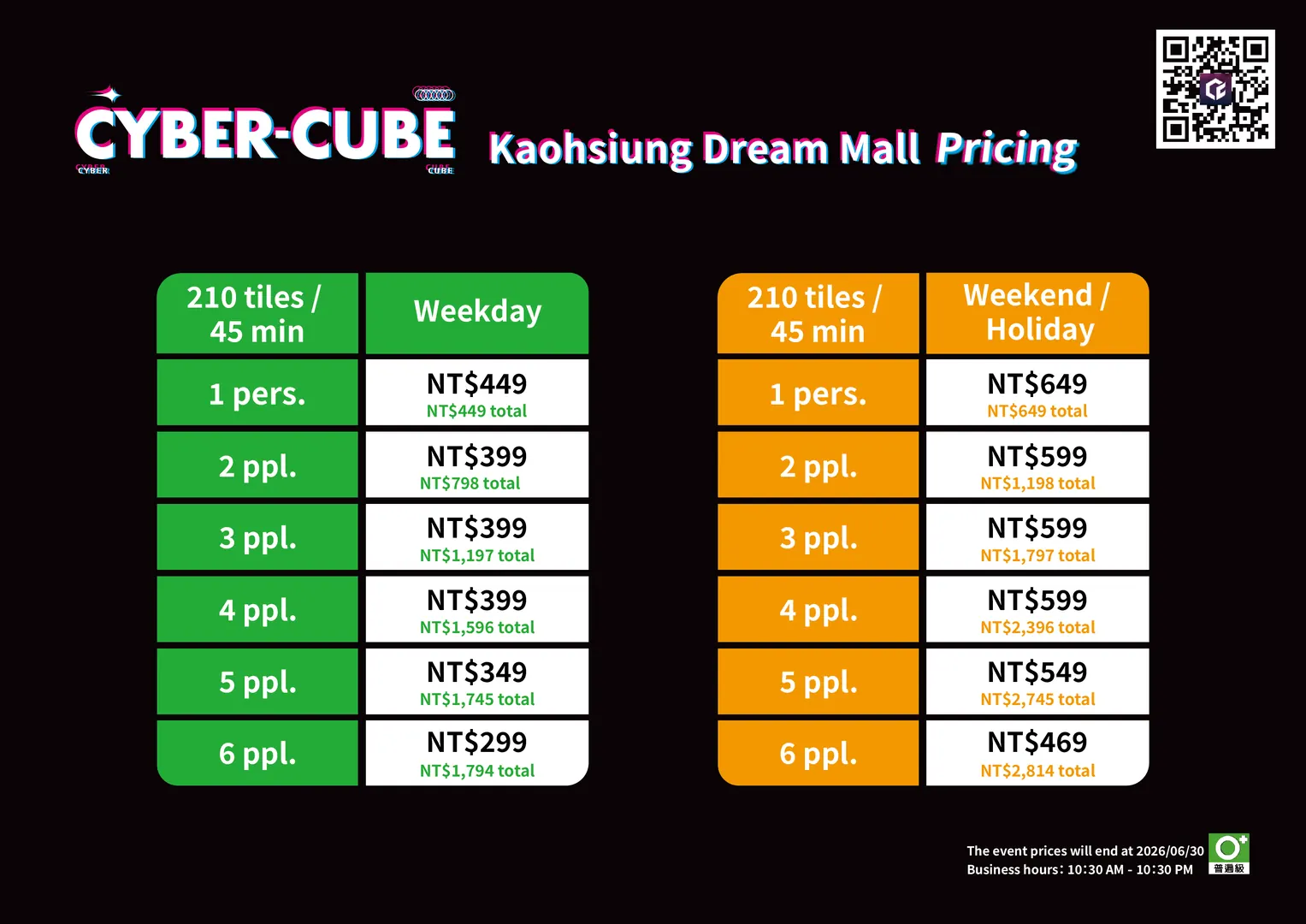The reservation platform offers different discounted, regular, and busy hour prices. Please refer to the reservation website for the exact pricing. For more details, check the official website or promotional materials. CyberCube reserves the right to final pricing and interpretation.
