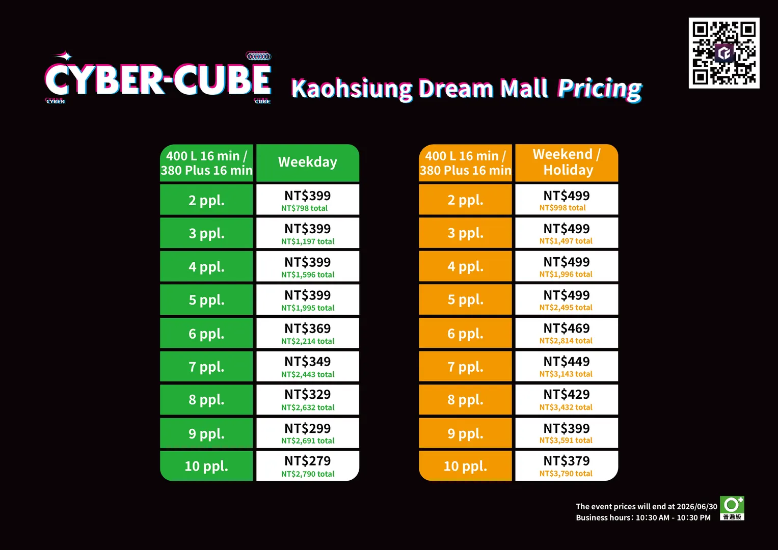 The reservation platform offers different discounted, regular, and busy hour prices. Please refer to the reservation website for the exact pricing. For more details, check the official website or promotional materials. CyberCube reserves the right to final pricing and interpretation.