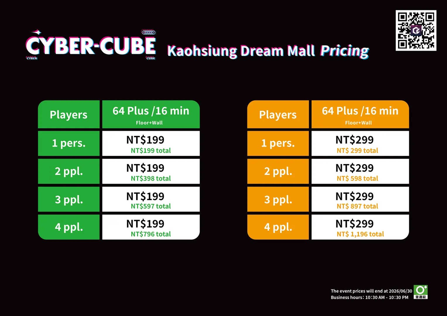 The reservation platform offers different discounted, regular, and busy hour prices. Please refer to the reservation website for the exact pricing. For more details, check the official website or promotional materials. CyberCube reserves the right to final pricing and interpretation.