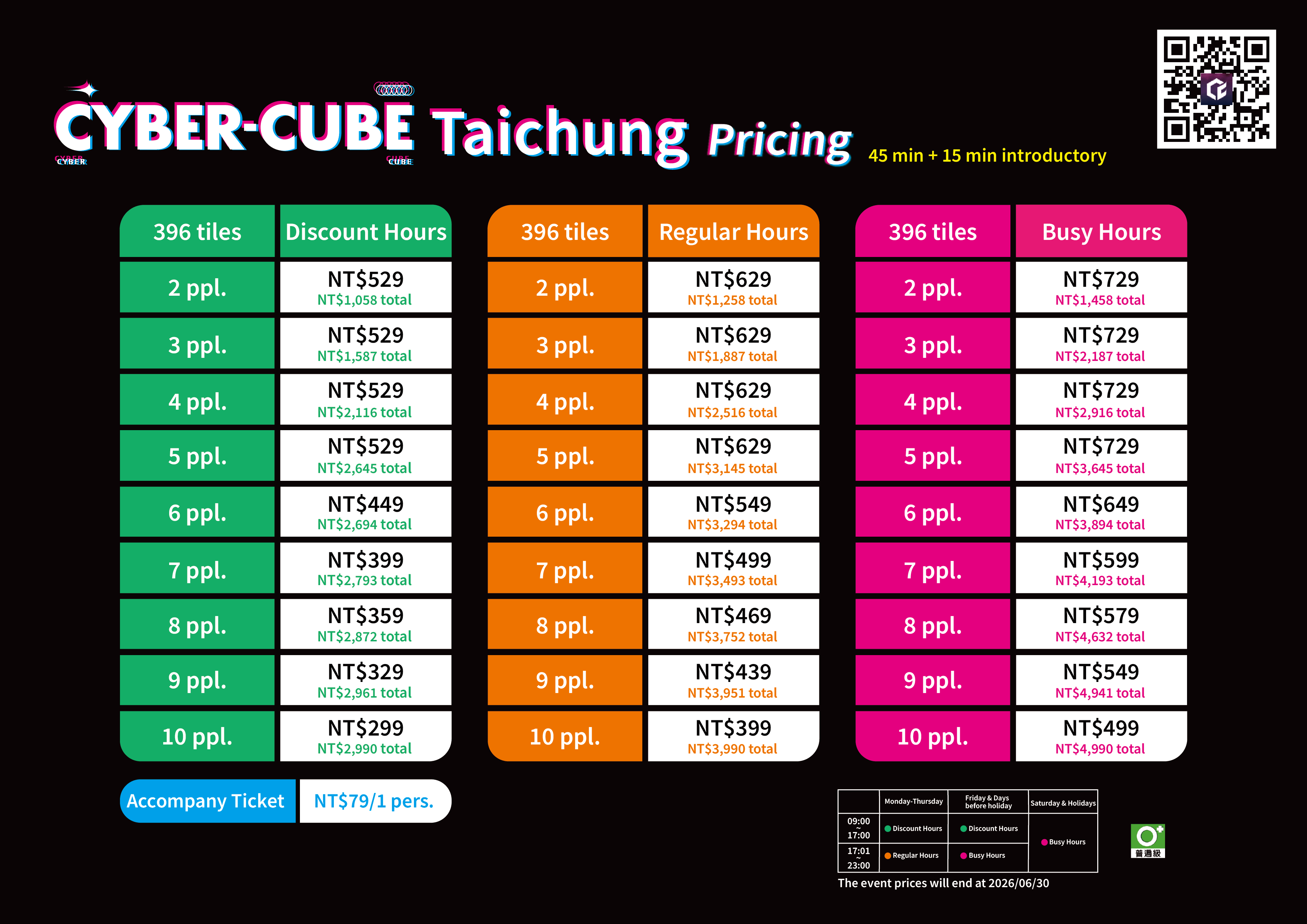 Due to game system limitations, the 396-Tile Challenge is designed for 2 to 10 players. If the number of players exceeds this limit, you must book consecutive time slots and split into groups. If groups wish to stay together throughout the session, Accompany Tickets must be purchased accordingly to ensure seating in the resting area.
