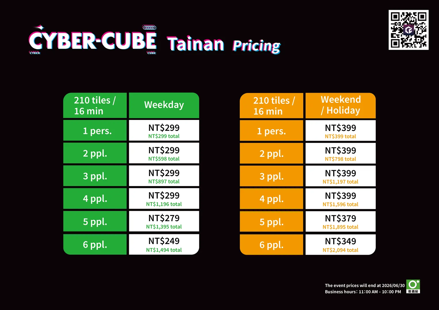 Due to game system limitations, the 210-Tile Challenge is designed for 1 to 6 players. If the number of players exceeds this limit, you must book consecutive time slots and split into groups. If groups wish to stay together throughout the session, Accompany Tickets must be purchased accordingly to ensure seating in the resting area.