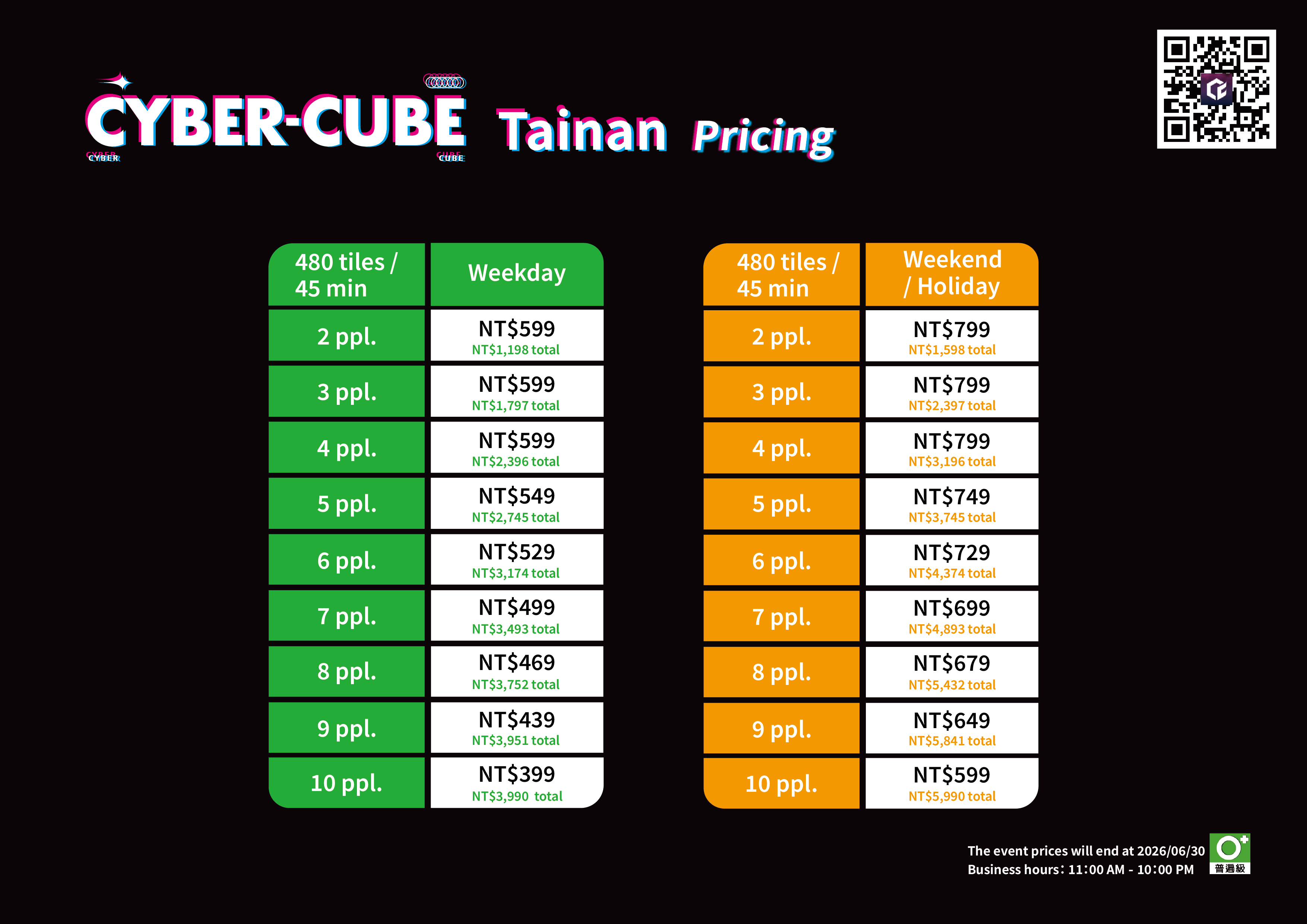 The reservation platform offers different discounted, regular, and busy hour prices. Please refer to the reservation website for the exact pricing. For more details, check the official website or promotional materials. CyberCube reserves the right to final pricing and interpretation.