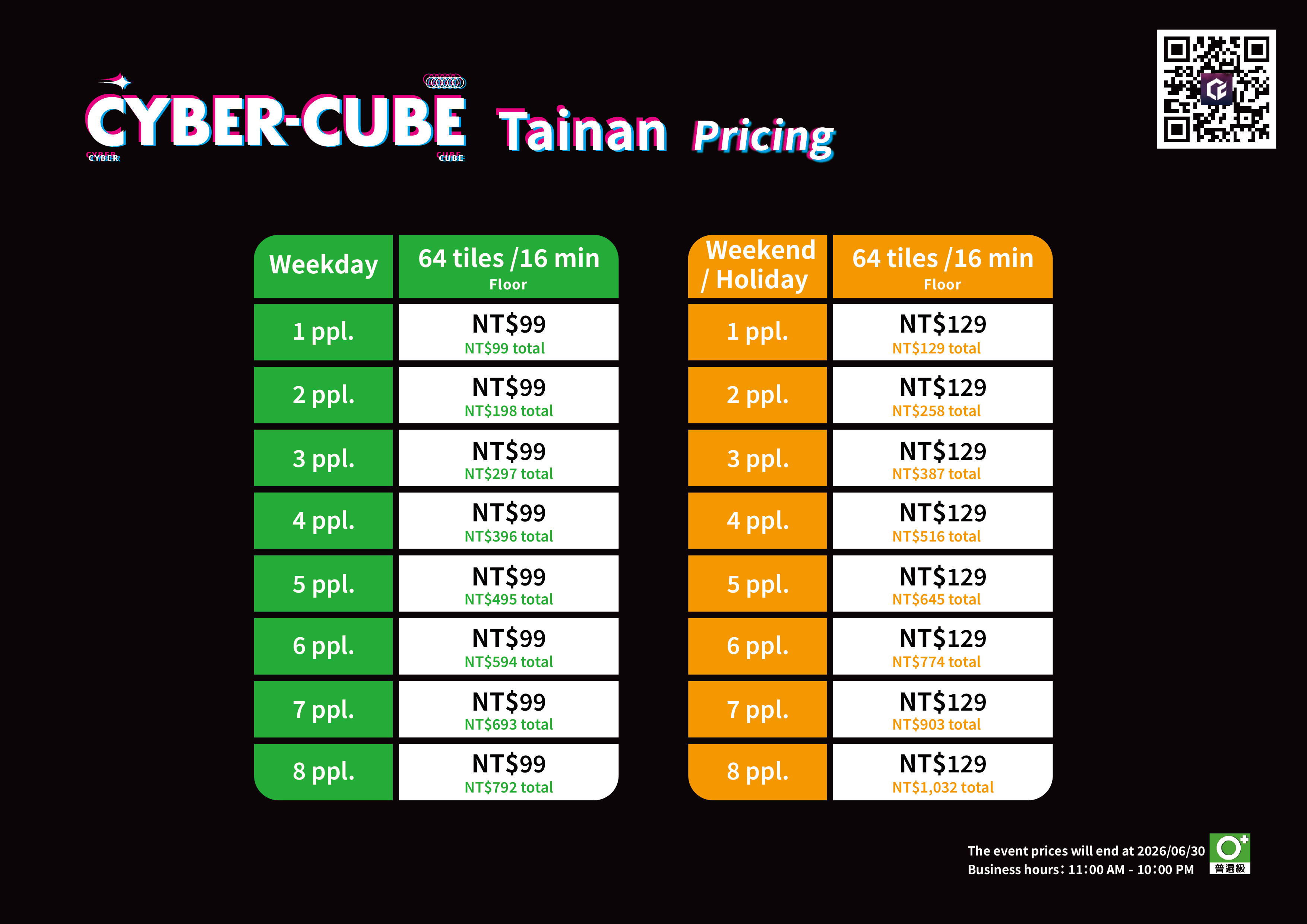 The reservation platform offers different discounted, regular, and busy hour prices. Please refer to the reservation website for the exact pricing. For more details, check the official website or promotional materials. CyberCube reserves the right to final pricing and interpretation.