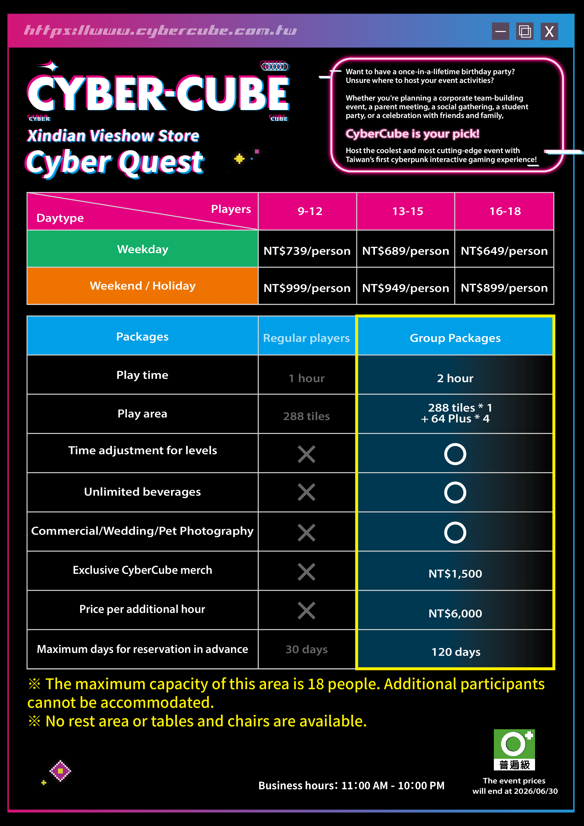 and add-on request as early as possible. Cyber Quest includes a 2-hour experience, covering gameplay briefing,