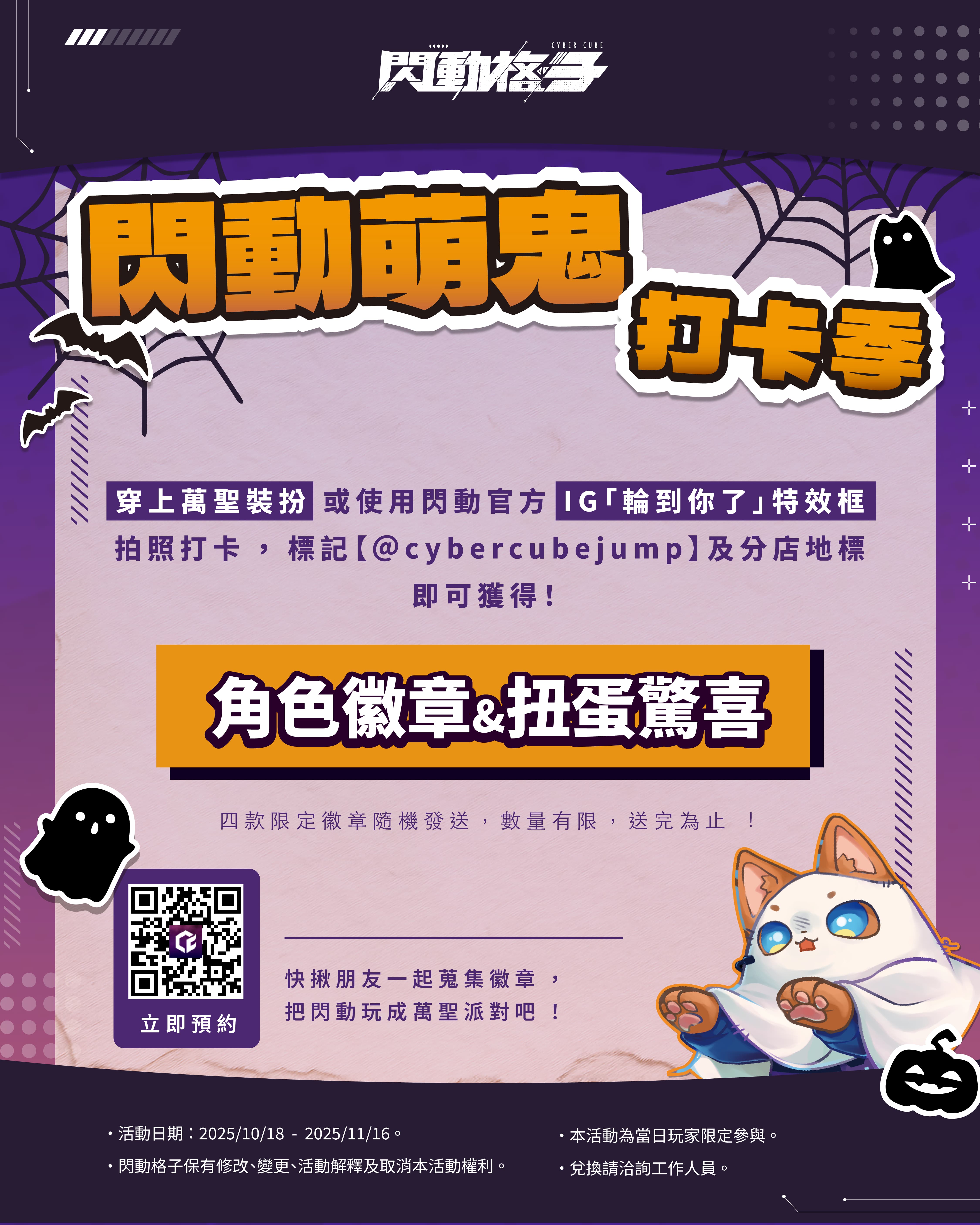 這個萬聖節,閃動格子準備了滿滿驚喜! 整個場域化身為 閃動萌鬼格子,等你來合拍 ! 快揪朋友一起挑戰、打卡,留下最閃亮、最可愛的萬聖夜回憶吧! 📸🍬 🎁 活動方式 穿上萬聖裝扮,或用官方 IG「輪到你了」框框拍照打卡, 標記【@cybercubejump】及分店地標 👉 即可獲得 角色徽章+扭蛋驚喜 🎁 四款限定徽章隨機發送,數量有限,送完為止! 快揪朋友一起蒐集徽章,把閃動玩成萬聖派對吧~ 🎉 📌本活動為當日玩家限定參與 #閃動格子 #體感遊戲 #11月活動 #CyberCube #送好禮