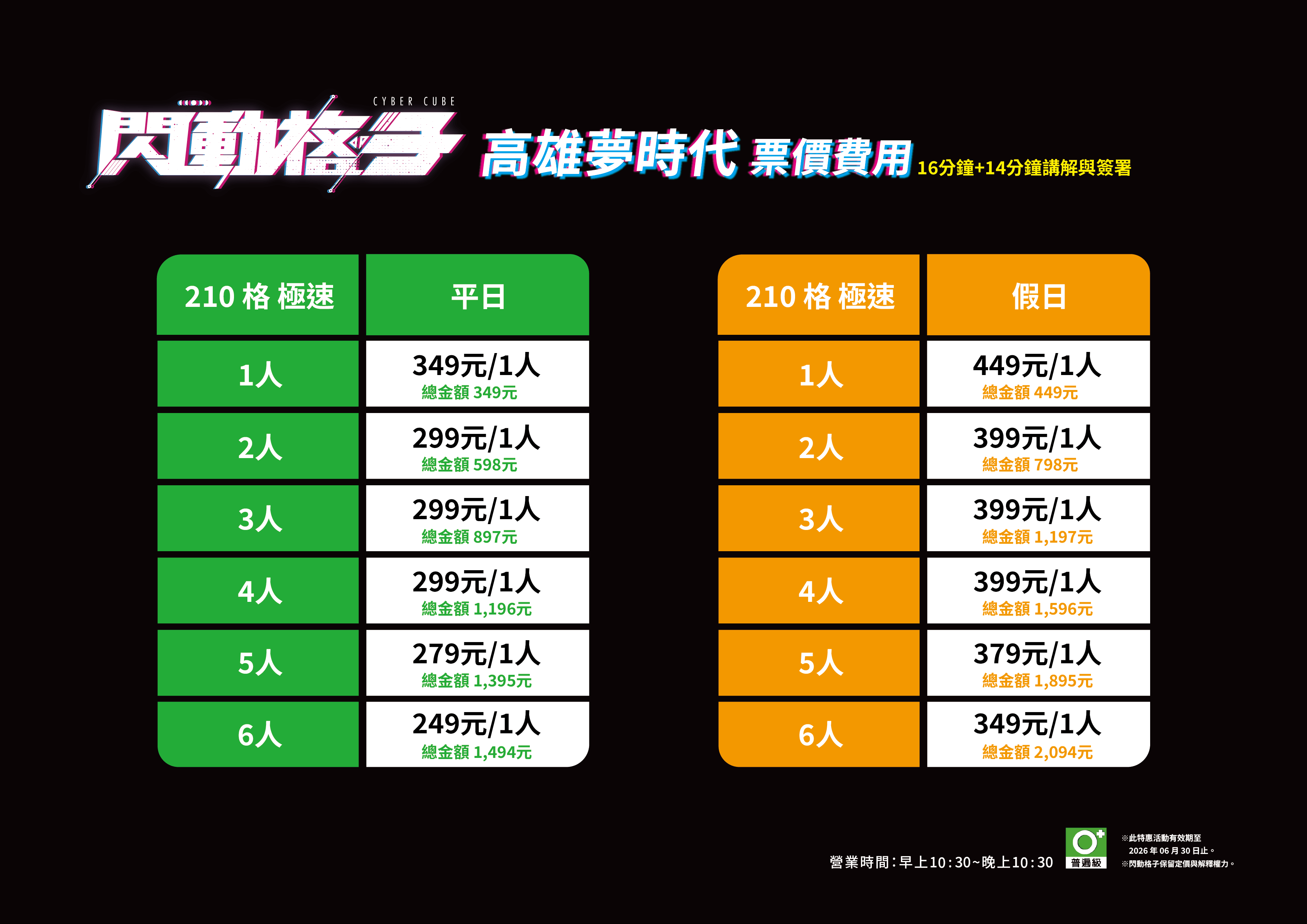 官方預約平台提供不同時段的優惠價格,具體費用請依照預約網站呈現為主,更多詳情請參考官方網站或宣傳品。「閃動格子」保留最終的訂價和解釋權利。