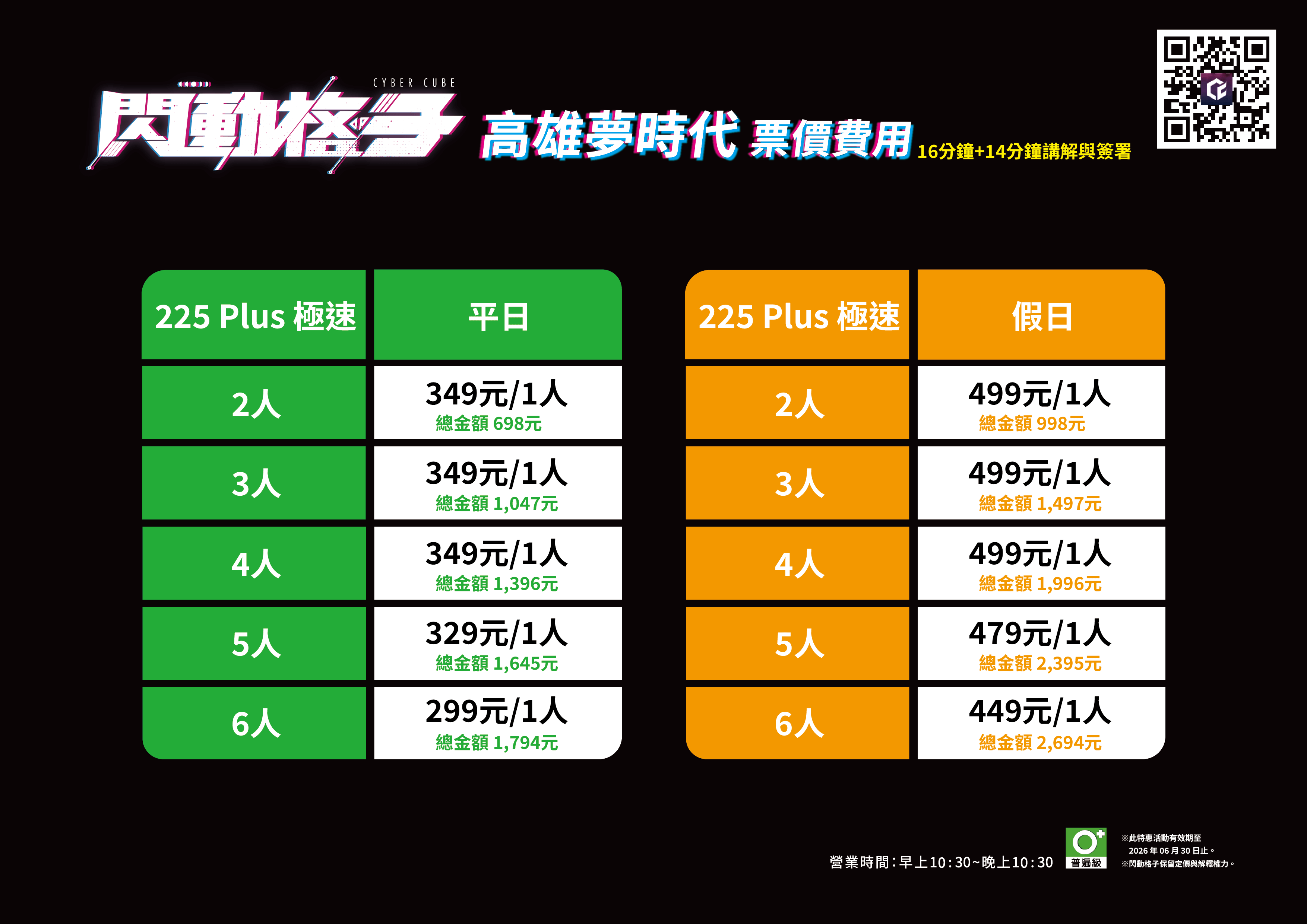 基於遊戲系統限制,225 Plus 挑戰場適用遊玩人數為 2 - 6 人。若超出適用人數,需預約連續時段並分組進行遊玩。