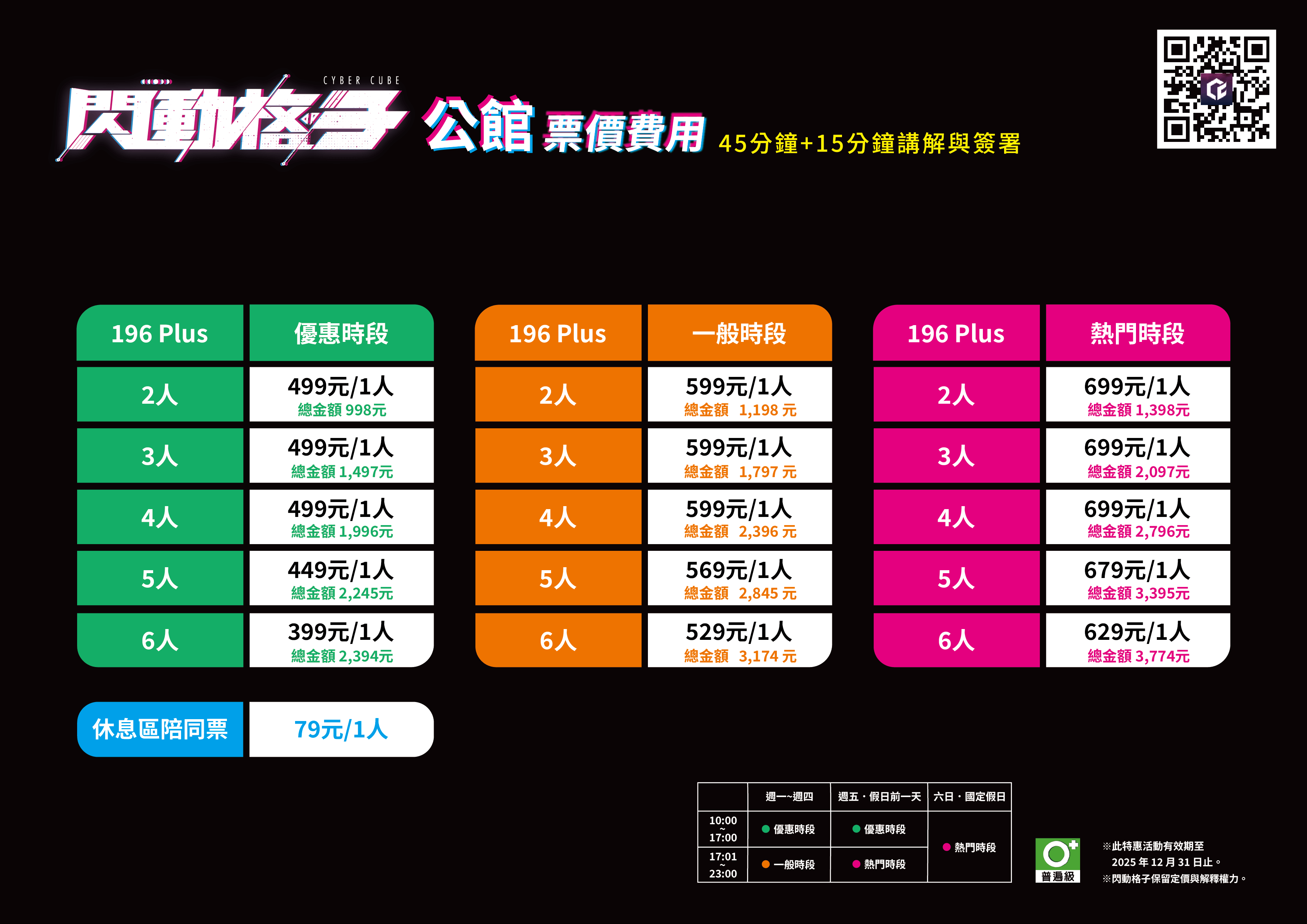 基於遊戲系統限制,196 Plus 挑戰場適用遊玩人數為 2 - 6 人。若超出適用人數,需預約連續時段並分組進行遊玩。若組別間希望全程陪同,須購買對應人數之陪同票,以確保休息區座位。