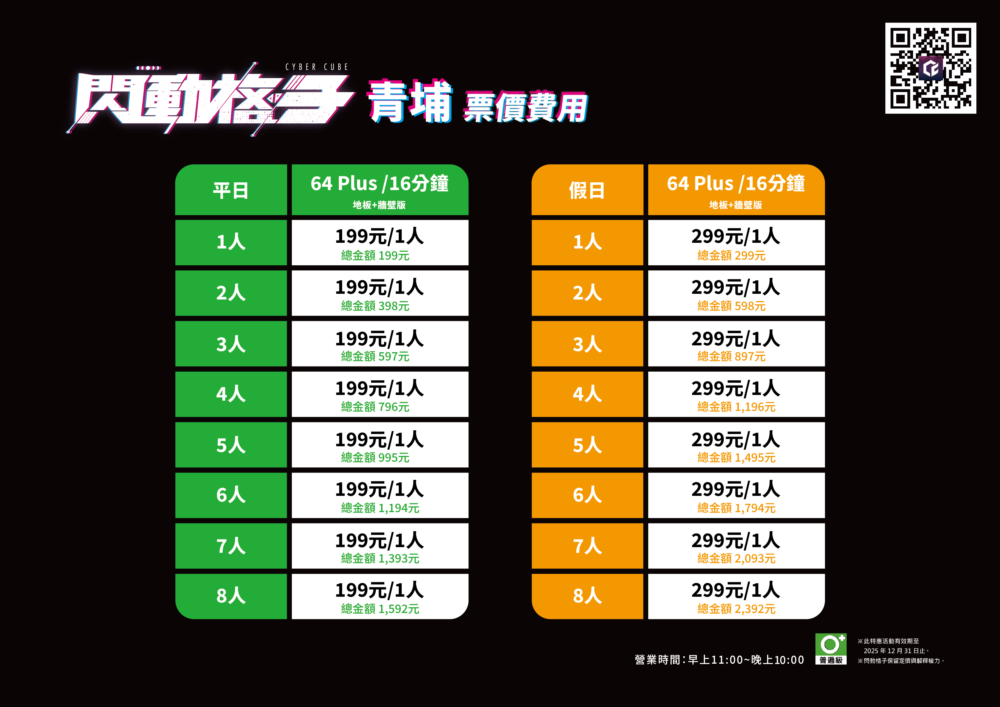 1. 僅可遊玩 64 格類型場域,需購買玩家票,並且全程由法定監護人陪同。
