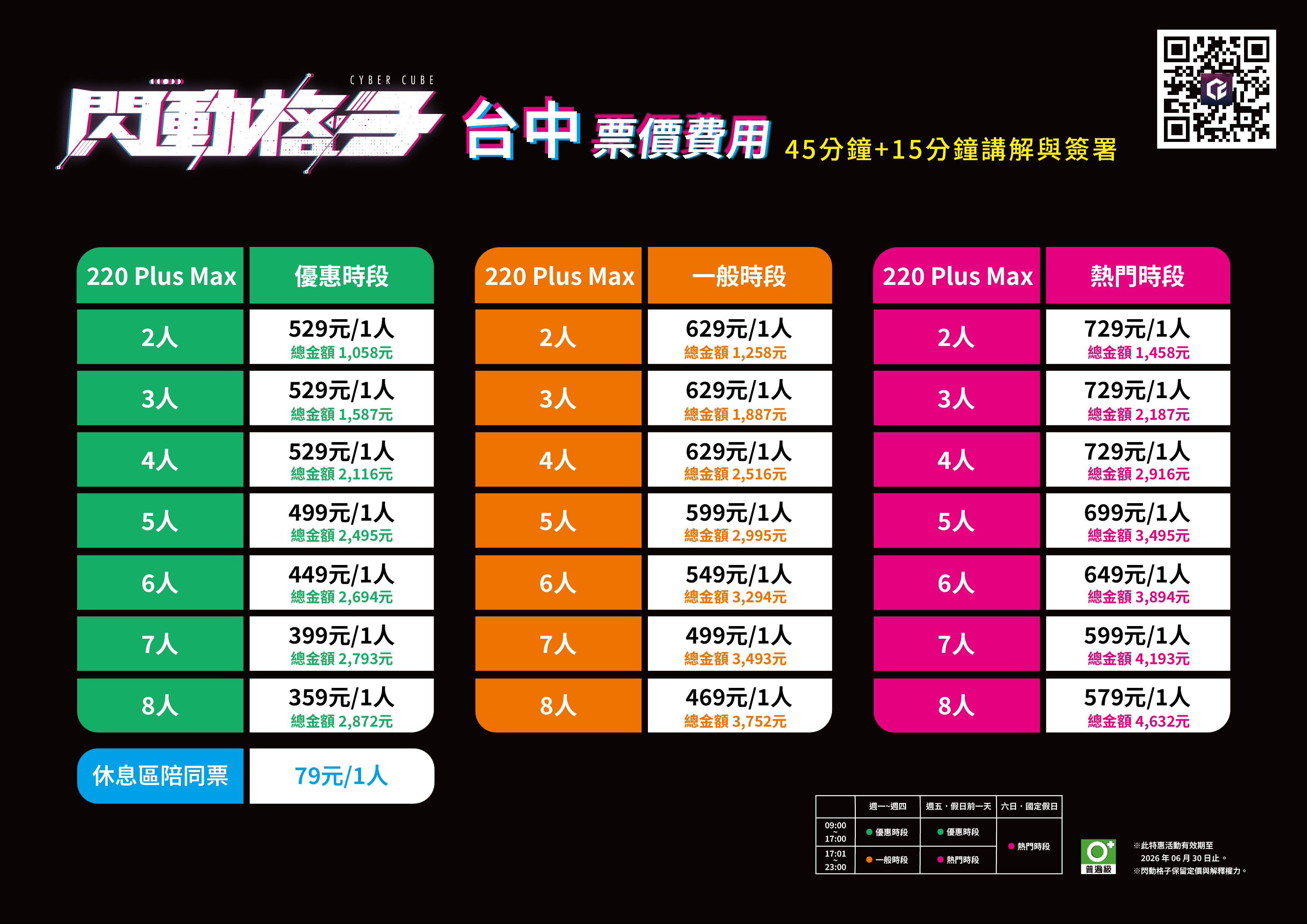基於遊戲系統限制,220 Plus Max 挑戰場適用遊玩人數為 2 - 8 人。若超出適用人數,需預約連續時段並分組進行遊玩。若組別間希望全程陪同,須購買對應人數之陪同票,以確保休息區座位。